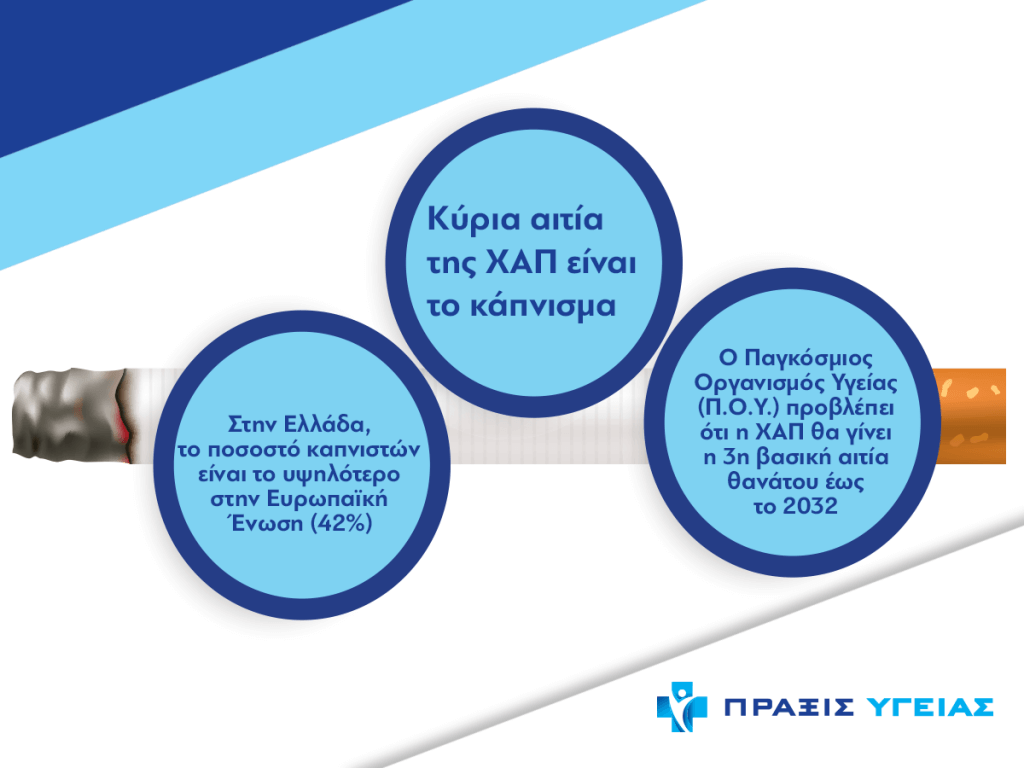 Η κύρια αιτία της ΧΑΠ είναι το κάπνισμα. Στην Ελλάδα, το ποσοστό καπνίσματος του πληθυσμού είναι το υψηλότερο της Ευρωπαϊκής Ένωσης (42%). Μία από τις λίγες πρωτιές της χώρας μας στην ΕΕ που είναι δυστυχώς θλιβερή.